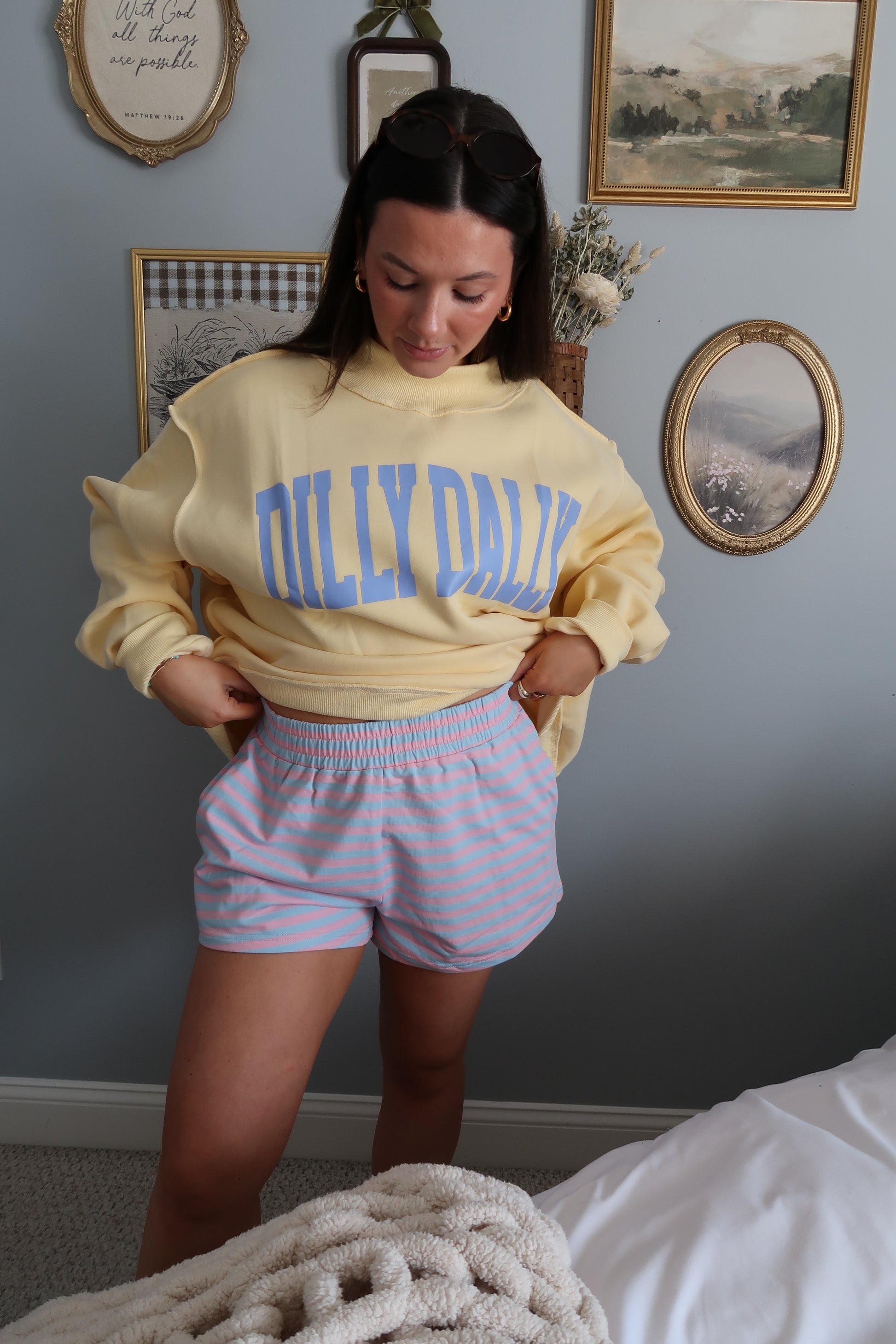 These shorts feature a relaxed fit, striped pattern, elastic waistband, & side pockets. Paired with our Dilly Dally Mock Neck Sweatshirt in Yellow.